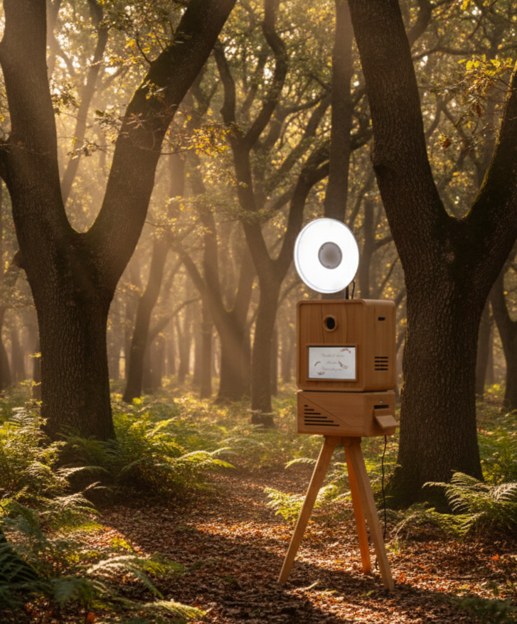 La station a été pensée comme un ensemble cohérent : la caisse photo, le module imprimante en teck naturel et le trépied sont réalisés en bois, pour un rendu chaleureux, soigné, et parfaitement adapté aux plus beaux événements.
